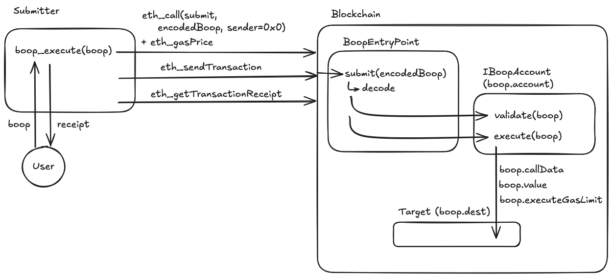 executefunction of the user's account contract. This function is responsible to acually carry out the intent of the boop — most likely that is making a call to another target contract, and the boop structure contains fields dedicated to this. -